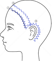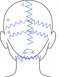 ⑥その下後頭部の骨の出ているところからまた耳の後ろまでジグザグ
